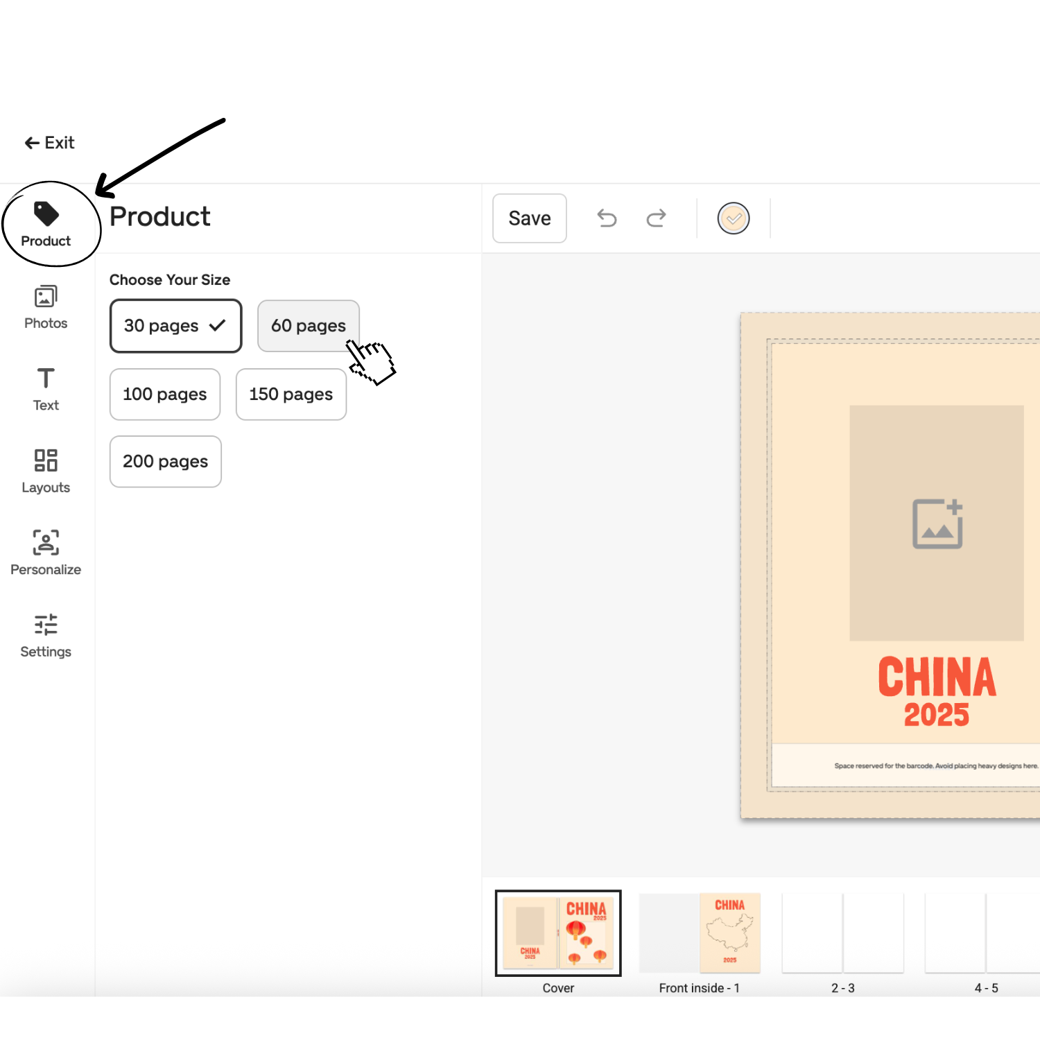 - Click the product tab and choose your book size.